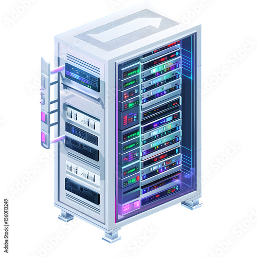High resolution 3D render showcasing An isometric technology rack with storage modules and control panels inside a white chassis. Top down view ideal for product mockups.
