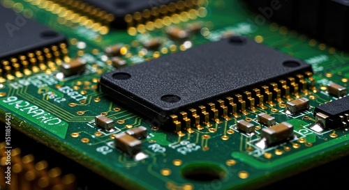 High Resolution Macro Close Up of Modern Microchip on Green Printed Circuit Board with Gold Connectors and Electronic Components for Technology Concepts