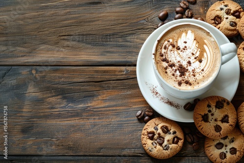 High Resolution Picture of Cappuccino or Latte with Frothy Foam with Cookie on Wooden Table