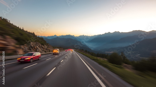 High speed motion blur from cars driving on a scenic highway through mountains at twilight