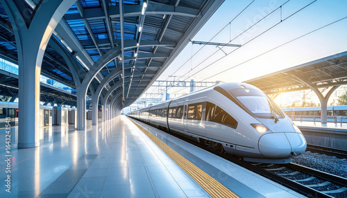 High speed train at modern station platform with sunlight and clear sky creating bright atmosphere