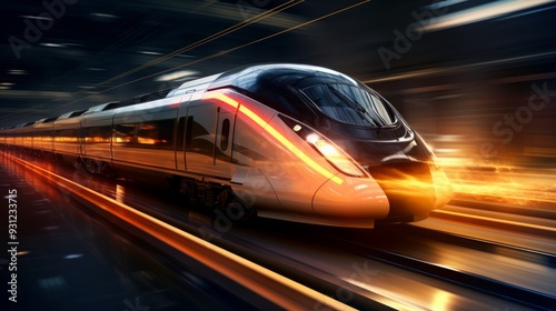 High speed train in motion on the railway station at sunset. Neural network ai generated art