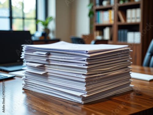 High Stack of Documents on Wooden Desk Office Papers Business Files Work