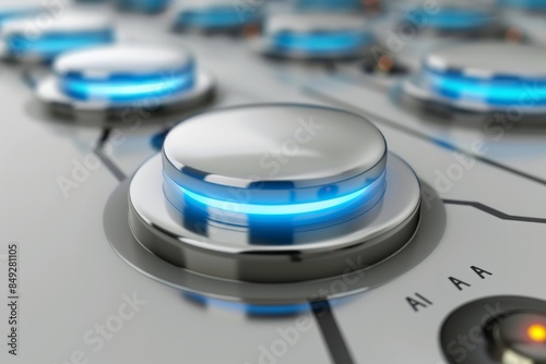 High Tech AI Interface with Blue and Silver Accents, Advanced Artificial Intelligence Concept, Futuristic Digital Innovations, Modern Technology Elements, Detailed Tech Design.