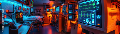 High tech ICU with ventilators and monitors displaying patient data. room is illuminated with blue and orange lights, creating clinical yet dynamic atmosphere