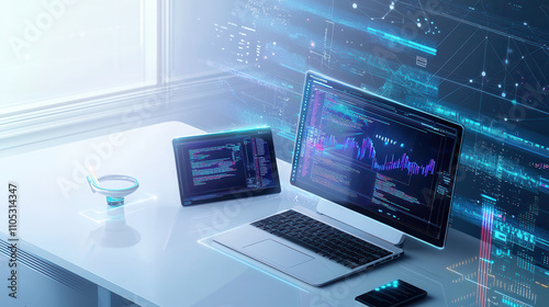 high tech workspace featuring laptop, tablet, and holographic screen displaying data visualizations and coding. modern setup enhances productivity and creativity
