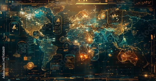 High tech world map, futuristic, metallic colors, 3D rendering, showing holographic data points and digital interfaces
