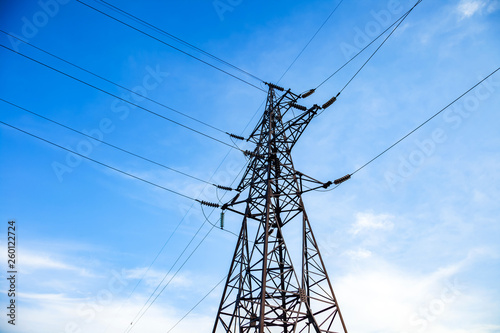 High voltage electricity pylon and transmission power line on the blue sky and white clouds on the background. Parts of electrical equipment and high voltage power line insulators.