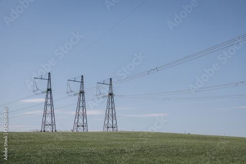 High voltage lines and power pylons in a flat and green agricultural landscape on a sunny day with cirrus clouds in the blue sky.