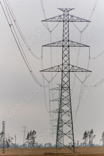 High voltage power line. Overhead electrical cables routed through an agricultural field.