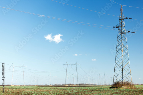 High voltage power lines running through agricultural fields in flat-lands on a clear sunny late winter day