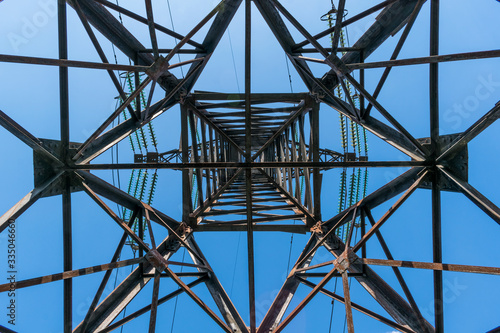 High voltage power pylons against a blue sky with clouds