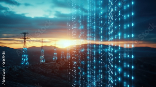 High voltage towers and power lines silhouetted against sunset, with digital elements representing energy flow and technology. stunning blend of nature and innovation