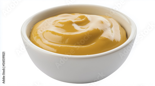 High-angle, close-up studio shot of a small, shallow white bowl filled with a creamy, golden-yellow sauce. The sauce has a smooth, slightly swirled texture, suggesting a thick consistency. The