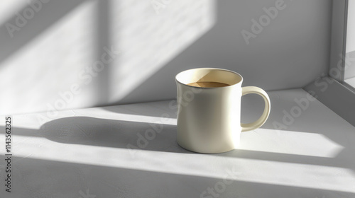 High-angle shot of a mug on a clean table, minimalist setup with shadows, perfect for branding