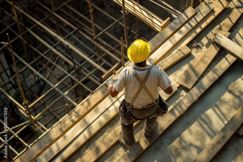 High-angle shot showing a worker from above as he navigates over wooden planks at a construction site