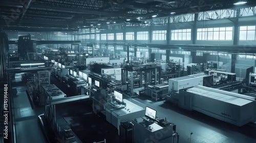 High-angle view of a large factory interior with extensive machinery and production lines.
