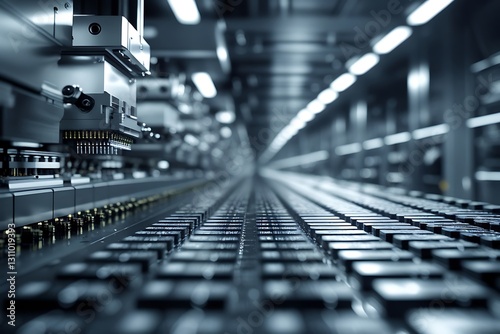 High-contrast close-up of semiconductor manufacturing with sleek metallic machinery and intricate microchips on a pristine surface