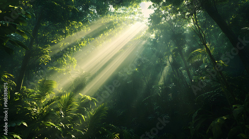 High-Definition Image of a Rainforest Canopy with Sunlight Filtering Through the Trees Illuminating the Green Foliage