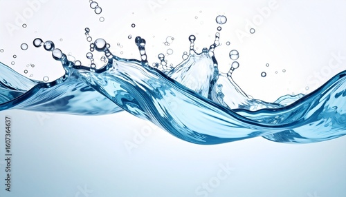 High-detail splash of water suspended mid-air against soft blue gradient background, capturing motion, purity, and freshness with floating droplets and dynamic flow.