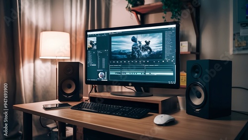High-end video editing setup with dual monitors and speakers in a well-organized and modern workspace