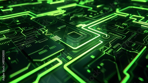 High-energy depiction of cyber data channels, using bright neon green and intense ultraviolet, laid out in a clear, minimalistic pattern against a shadowy backdrop