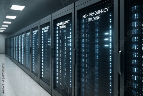 High-frequency trading servers in a modern data center with illuminated lights and dark background for technology and finance infrastructure concept. Ai generative