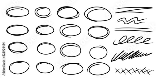 Highlight oval marker frames line. Hand drawn scribble circle underline sketch set. Doodle ovals and ellipses line template. Vector illustration isolated on white background.