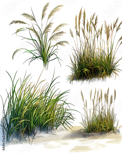 Highly detailed illustrations of various trees, leaves, grasses, and botanical elements, featuring realistic, minimalist, and abstract compositions on a white background.