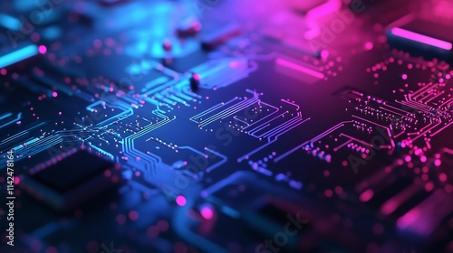 Highly Detailed Quantum Computing Chip with Blue and Purple Illuminating Quantum Circuits