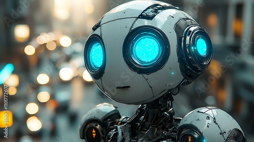 Highly detailed resin model of a futuristic robot, sleek metallic surfaces, glowing blue lights, cyberpunk-inspired design