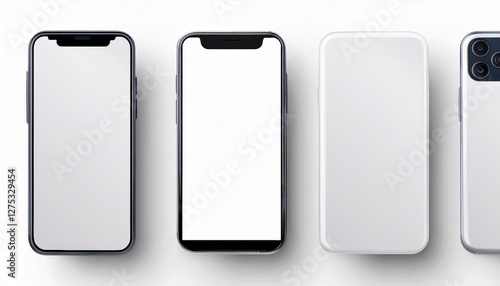 Highly Realistic 3D White Mockup of Modern Smartphone Set with Blank Screen Captivating, Minimalist, and Futuristic, Perfect for Digital Art, Design Inspiration, or Home Decor.