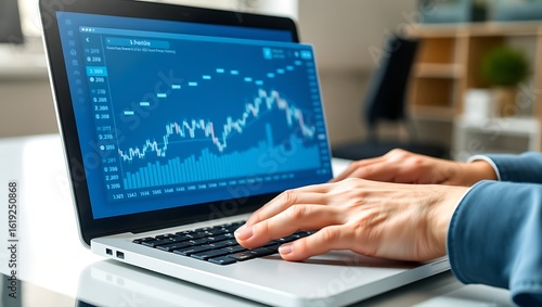 High-quality closeup of hands typing on a laptop, with a professional analyzing a growing stock market chart and financial data on the blue screen.