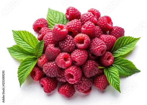 High-resolution aerial shot: vibrant fresh raspberries isolated on a pristine white background.