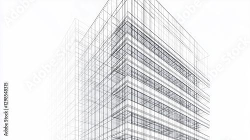 High-resolution architectural visualization of a modern skyscraper, focusing on the transparent glass exterior and precise grid pattern
