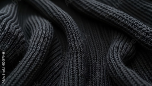High-Resolution Black Knit Fabric Texture, Close-Up of Knit Sweater Material with Copy Space, Ideal for Sportswear Design Elements
