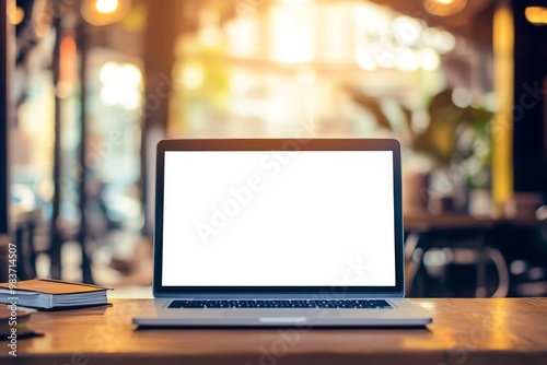 High-resolution close-up of a laptop with a blank white screen on a table in a coffee shop, with blurred background and bokeh effect.