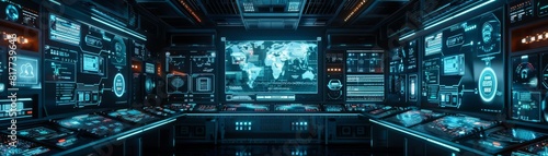 Highresolution display of a digital security system, featuring active scanning and surveillance technology in a futuristic setting