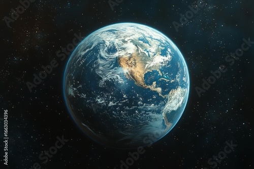 High-resolution Earth in space glows under starlight showcasing oceans, continents and atmosphere in cosmic serenity