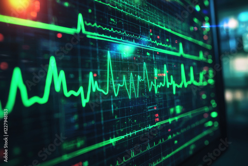 High-resolution EKG monitor displays a healthy heartbeat with vivid green lines and sharp detailing