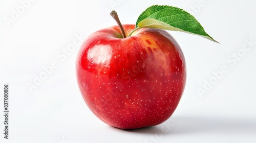 Highresolution image of a fresh, juicy red apple with a green leaf, isolated on a white background