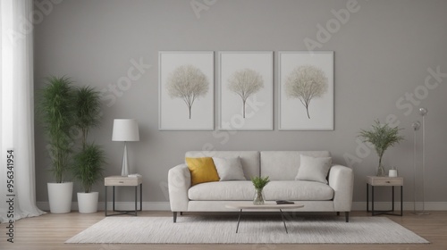 High-resolution living area with sofa and photo frames on the wall, other accessories interior design image template. Living room interior image.