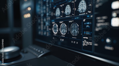 High-resolution MRI scans displayed on a modern computer screen in a medical facility, showcasing brain imaging technology.