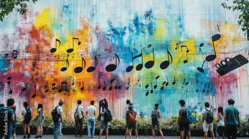 High-resolution photo of a large wall mural depicting colorful musical notes and instruments, with people admiring it during a street festival for International Music Day.
