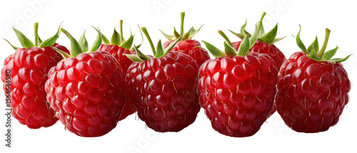 High-resolution raspberries in a row, juicy texture and realistic shadow, isolated on a Transparent background, PNG file.