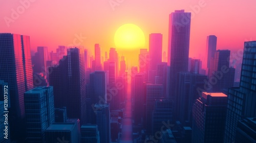 High-resolution view of the sun dipping below the horizon, framed by towering skyscrapers, with vibrant colors and long shadows stretching across the cityscape.