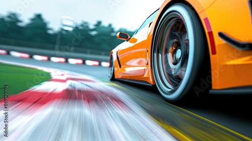 High-speed action shot of an orange sports car racing on a track, capturing the motion and thrill of the race with a blurred background.