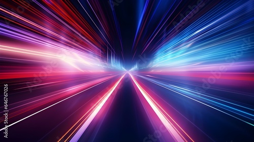 High-speed blur zoom effect, neon color motion on a speedway, panoramic high-speed technology concept, lights abstract background. Sci-fi illustration with neon lights and road. Generative AI.