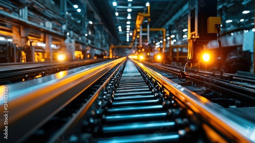 High-speed conveyor moving aluminum billets towards the extrusion press, futuristic production line
