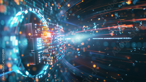 High-speed data concept with glowing lights streaming through futuristic tunnel.